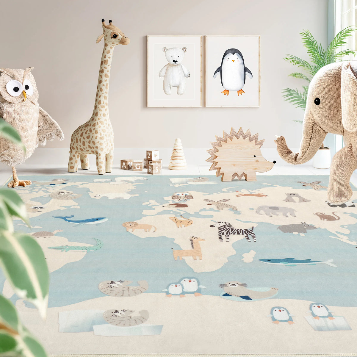Tappeto Zoonia 120×120 cm quadrato posato in cameretta o playroom, tappeto educativo con mappa e animali illustrati.