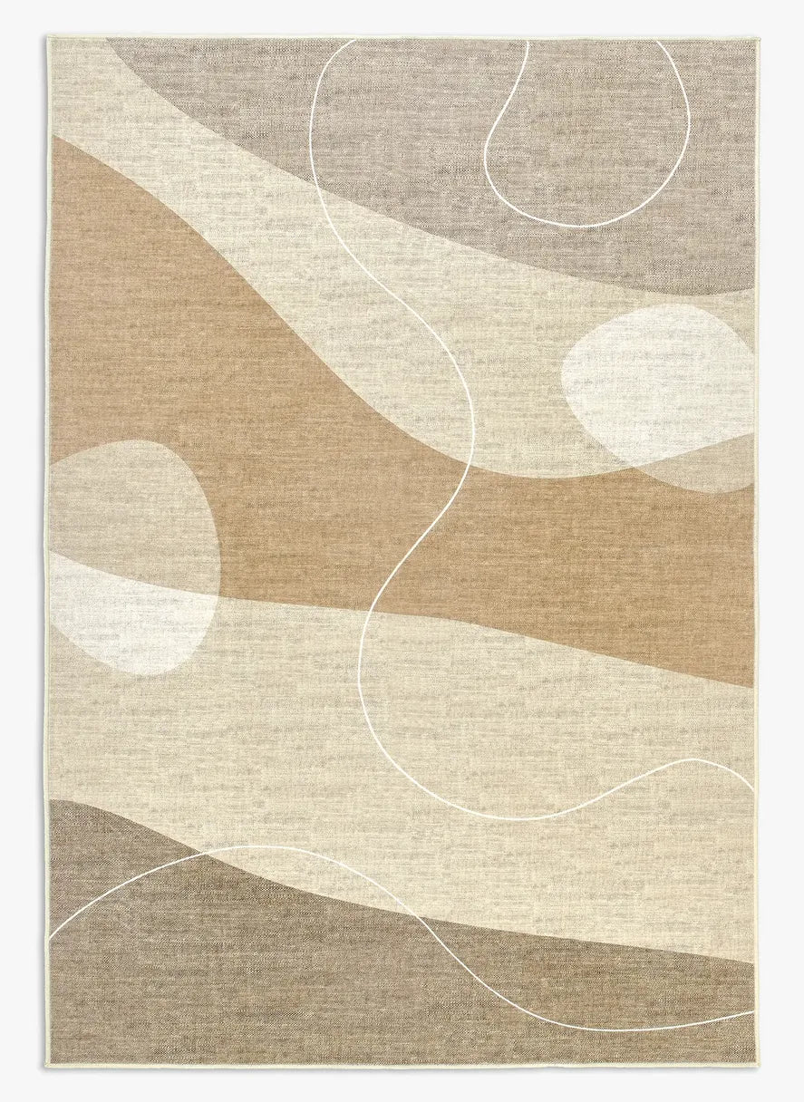 Tappeto Dunis 200x290 cm ambientato in open space moderno, con pattern naturale a onde nei toni sabbia e panna
