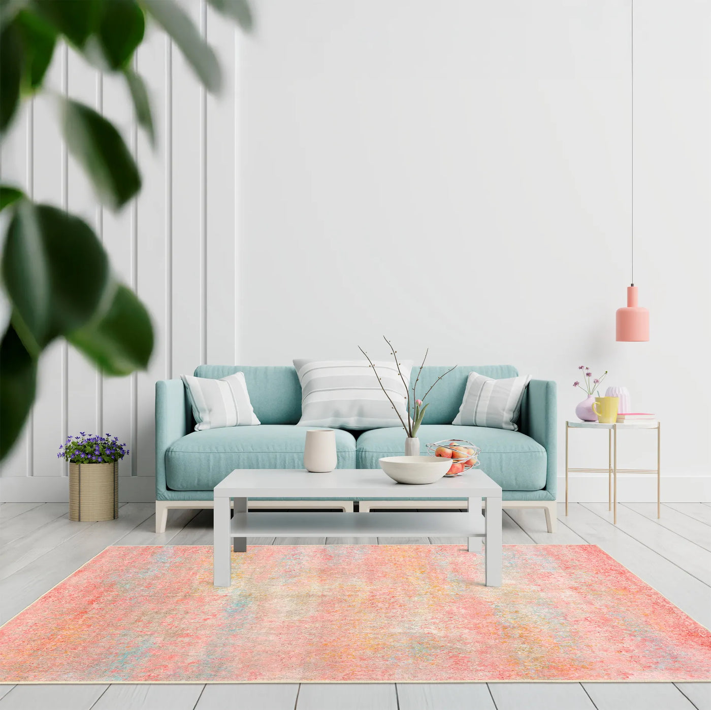 Tappeto Fiorith bouclé 3D 200×290 cm in soggiorno moderno, palette rosa e azzurro.